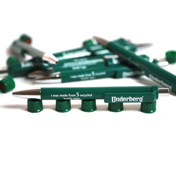 Der Underberg-Kugelschreiber besteht aus fünf recycelten Kapseln, wodurch ein klassisches Upcycling-Produkt kreiert wurde, das für Nachhaltigkeit steht.